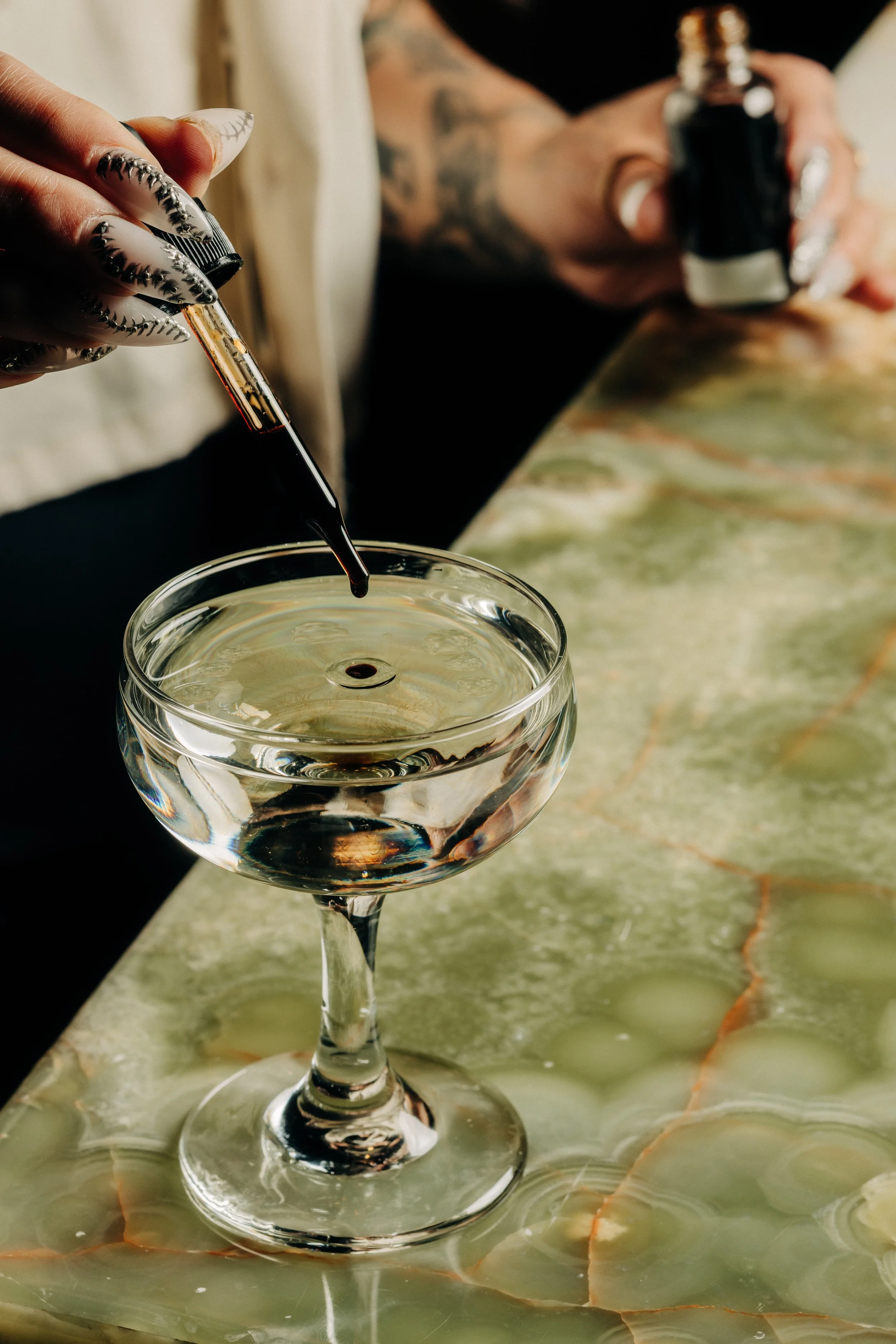 Inspired by the showdown in the first chapter where you find the scenes go from greyscale to color; enhancing the intensity of the fight sequence. A layered cocktail that slowly transforms the more you stir the acid adjusted pomegranate into your beverage.